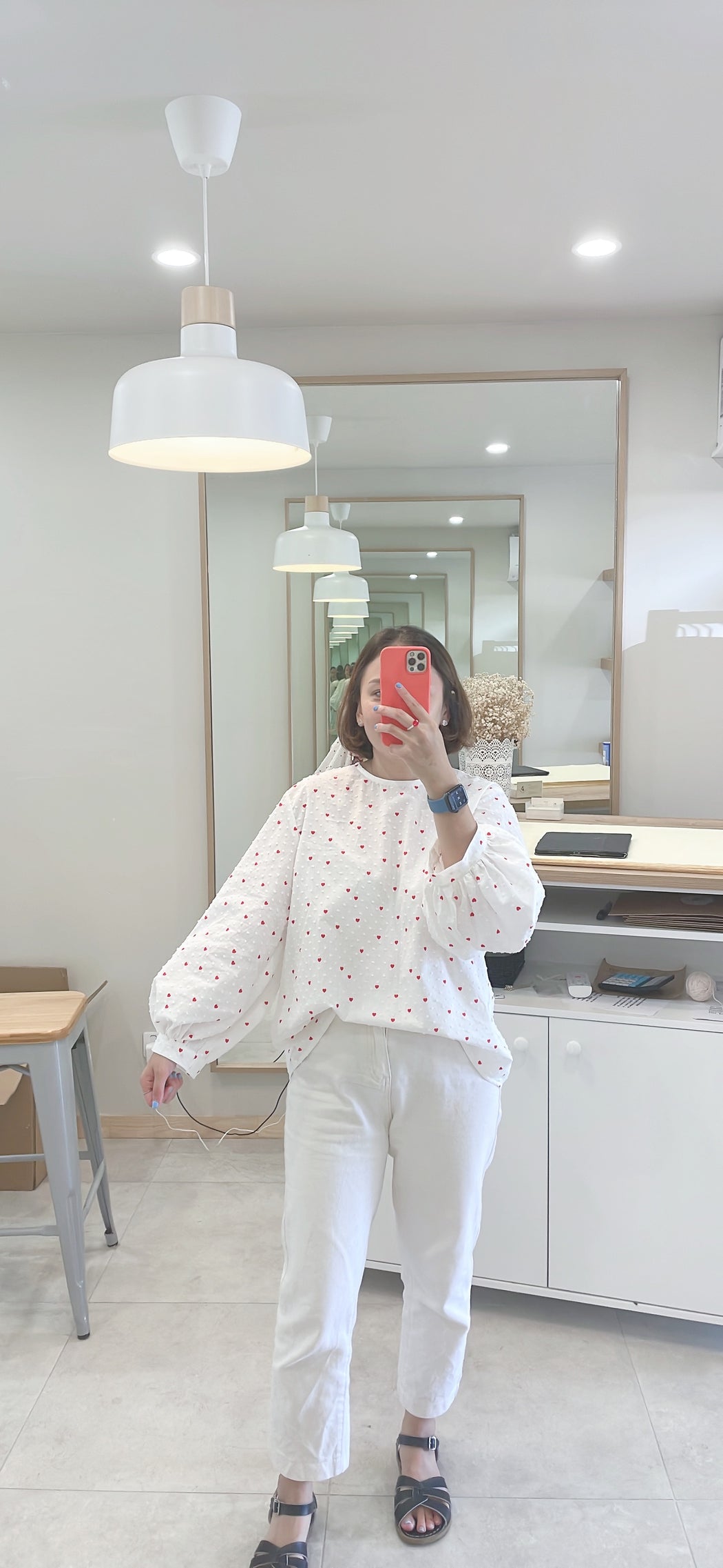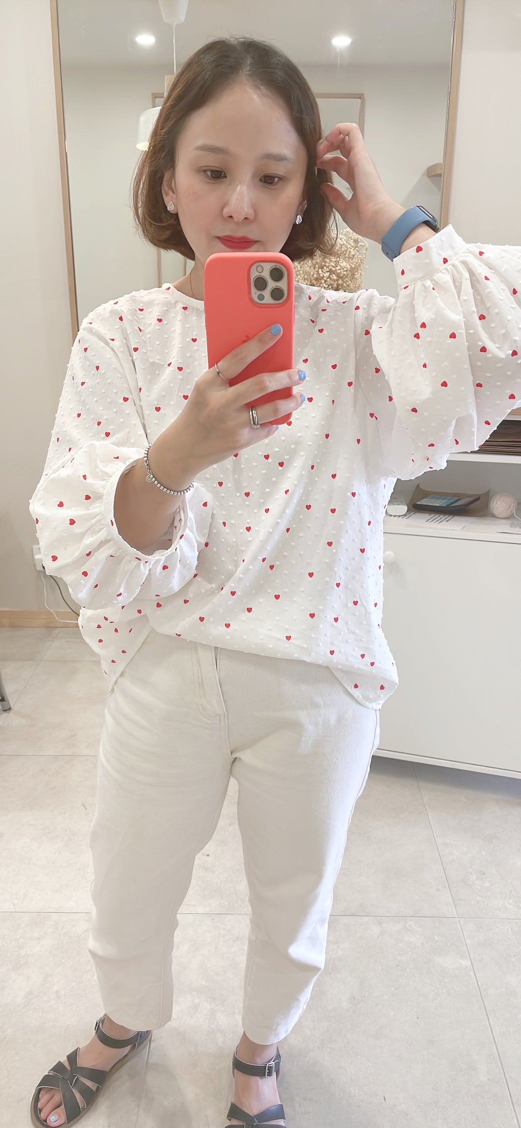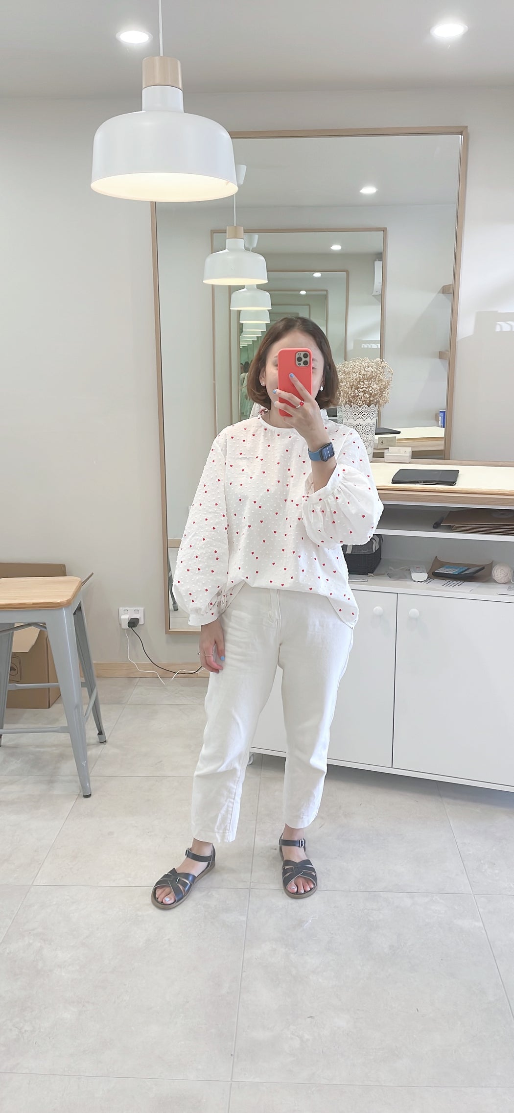 This high quality shirt is made with 100% cotton. Loose fit and simple and classic with little dots of embroidery and little red printed hearts!
