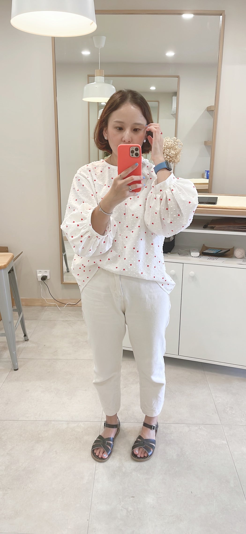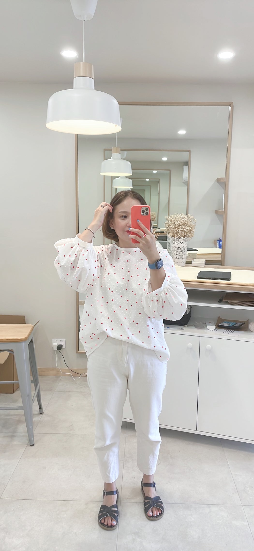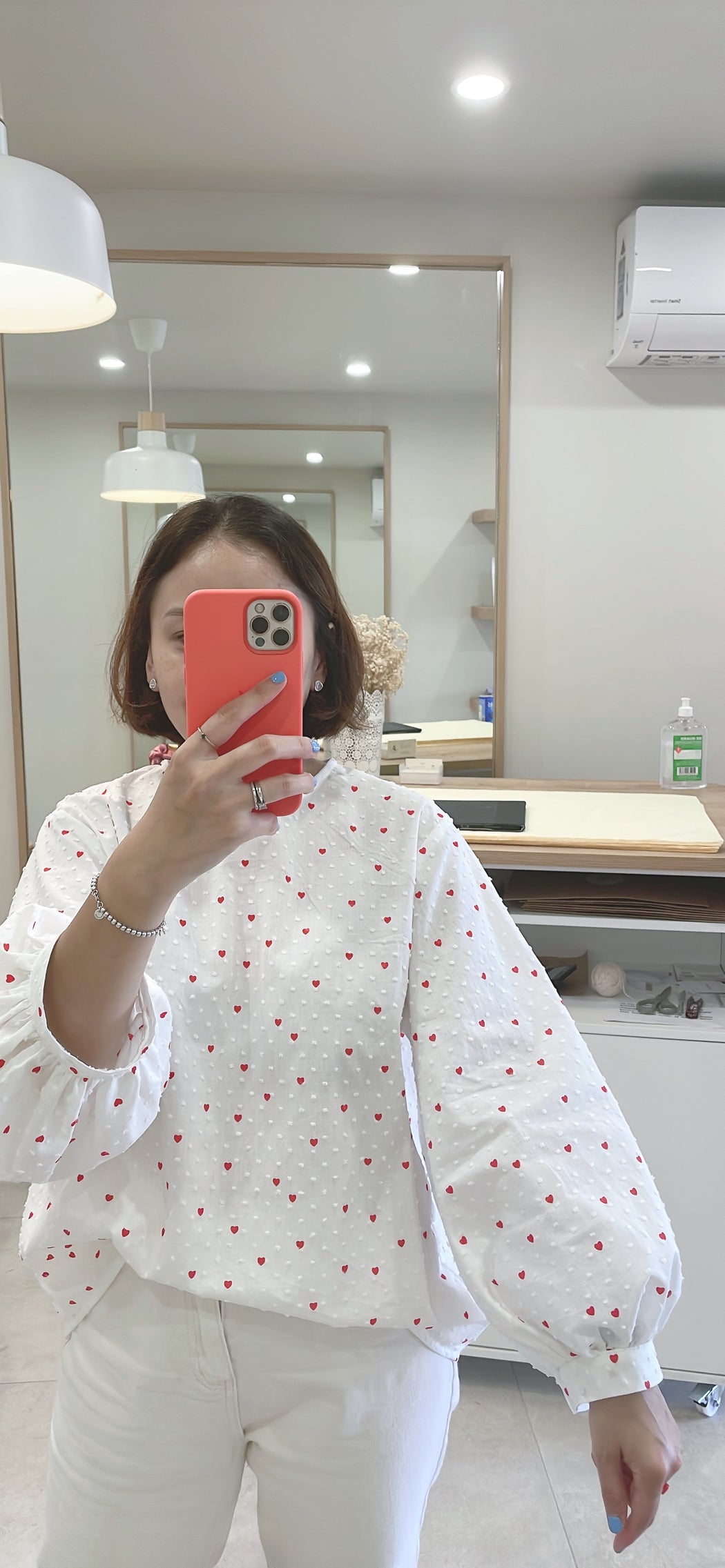 This high quality shirt is made with 100% cotton. Loose fit and simple and classic with little dots of embroidery and little red printed hearts!
