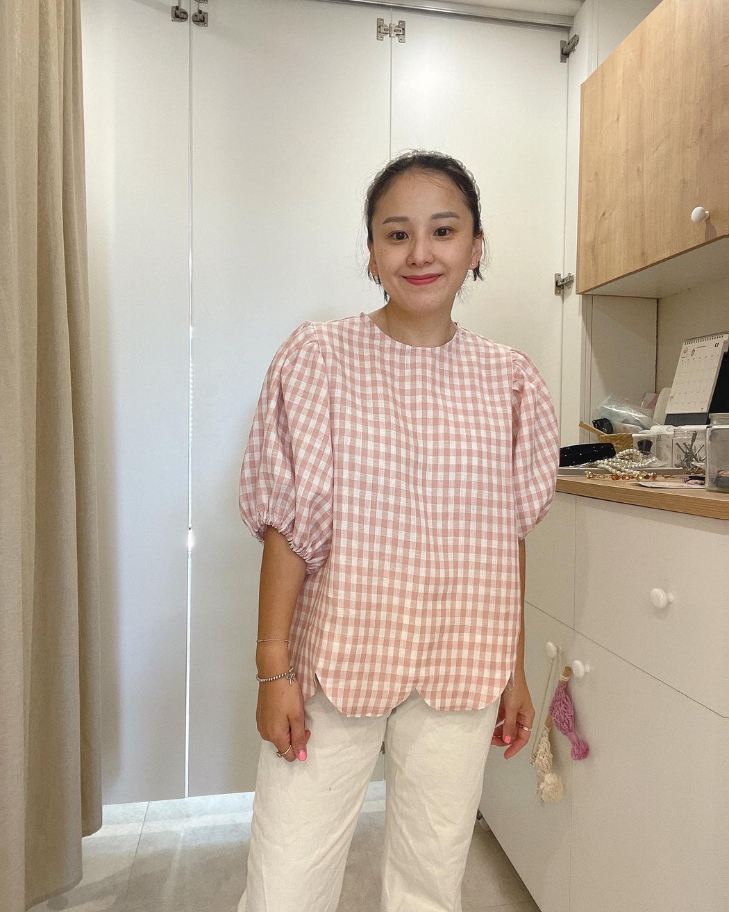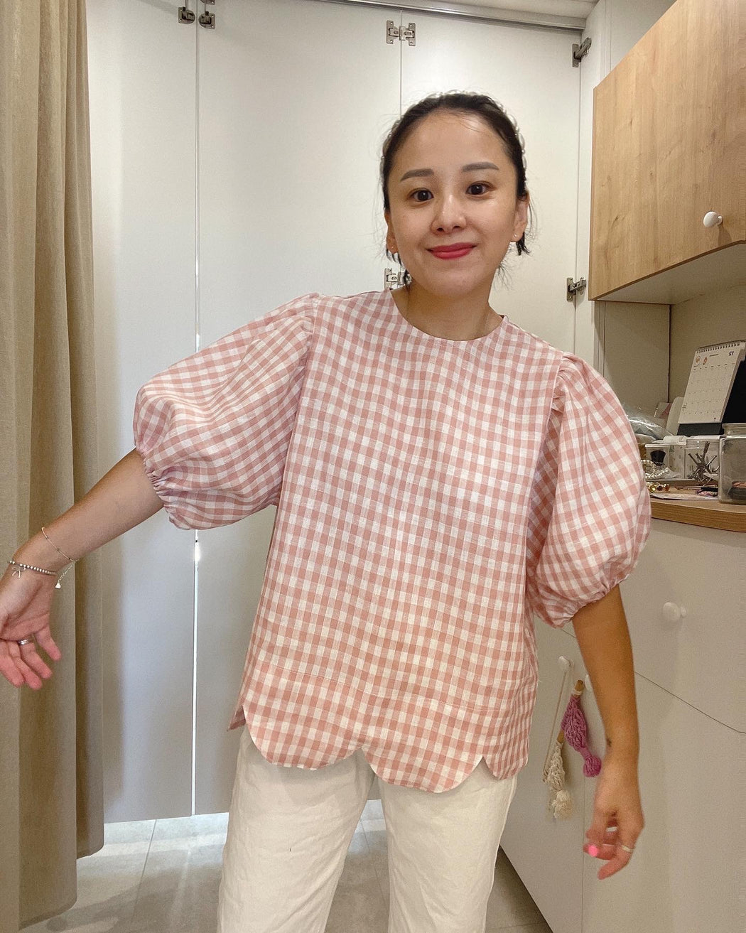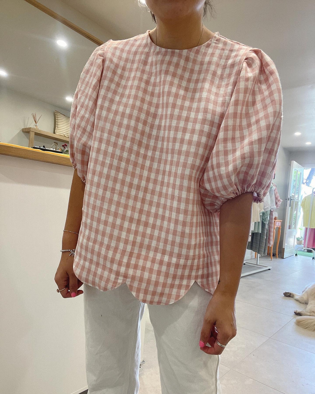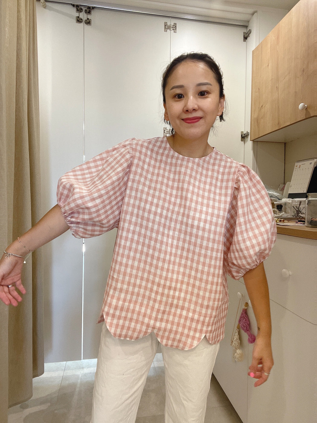 Scallop finish pure natural linen pink blush gingham check blouse!