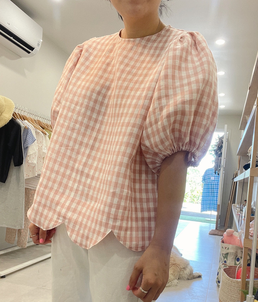 Natural gingham check linen scallop blouse
